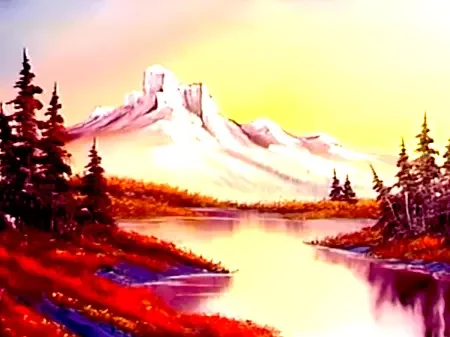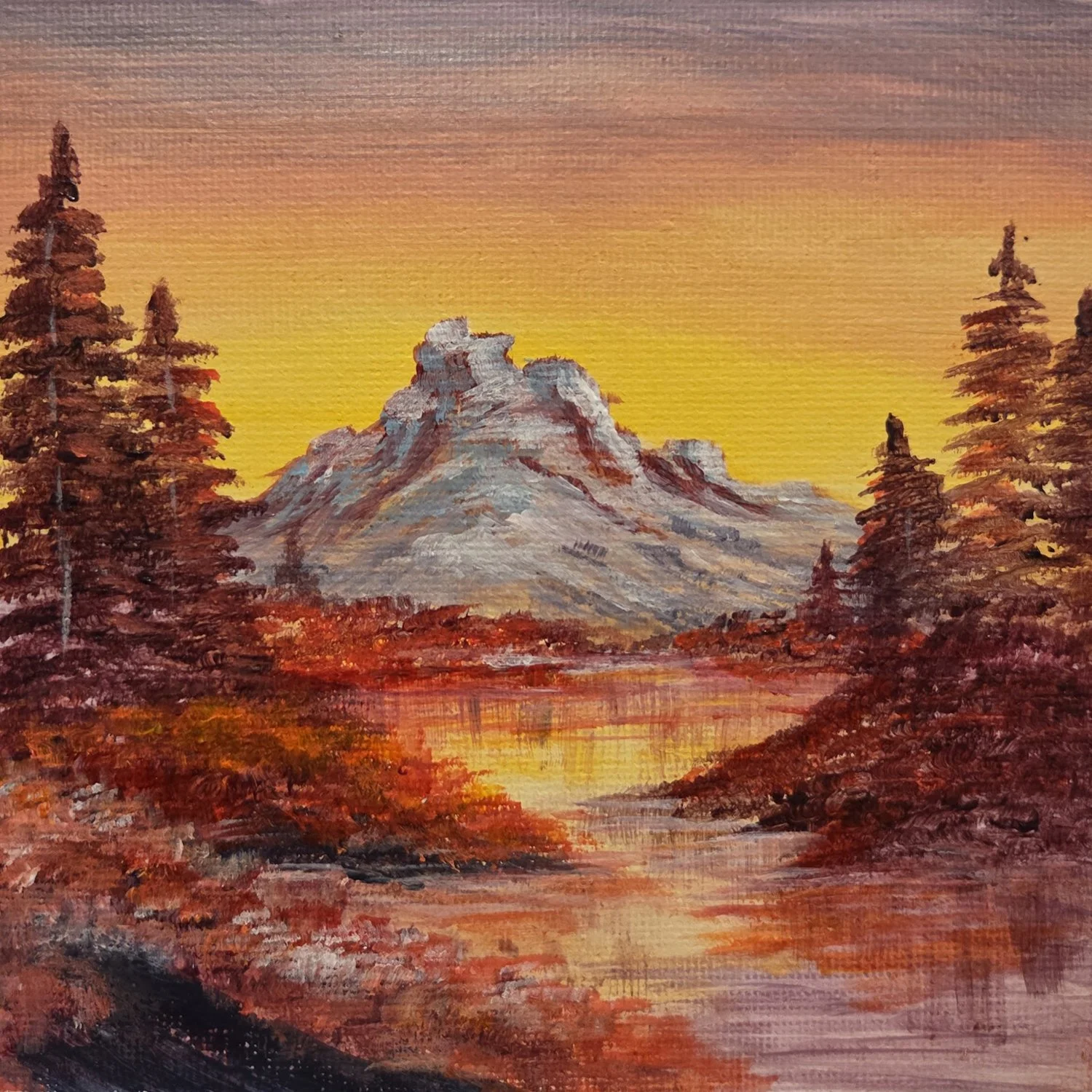 I really like my mountain but I think my foliage in the front areas could use some work. With this one, I really enjoyed the color scheme–I didn’t realize that I actually created the mountain as the main ‘hero’ of this painting until the end, and I kind of love it. With all my other paintings with mountains, I kept trying to keep them distant but I love that for this one, it stands out amongst all the warmer colors. It’s definitely different from what we’ve been doing and I like the change of pace.